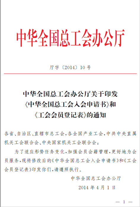 中华全国总工会办公厅关于印发《中华全国总工会入会申请书》和《工会会员登记表》的通知