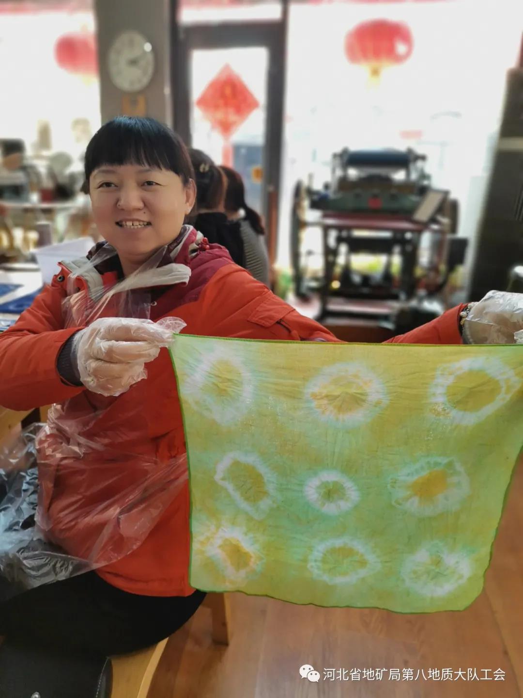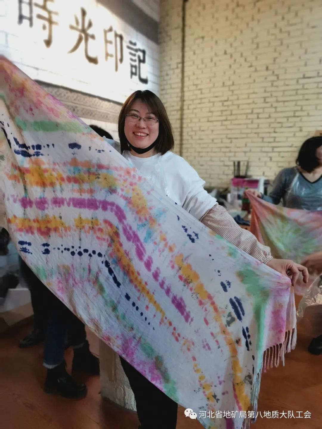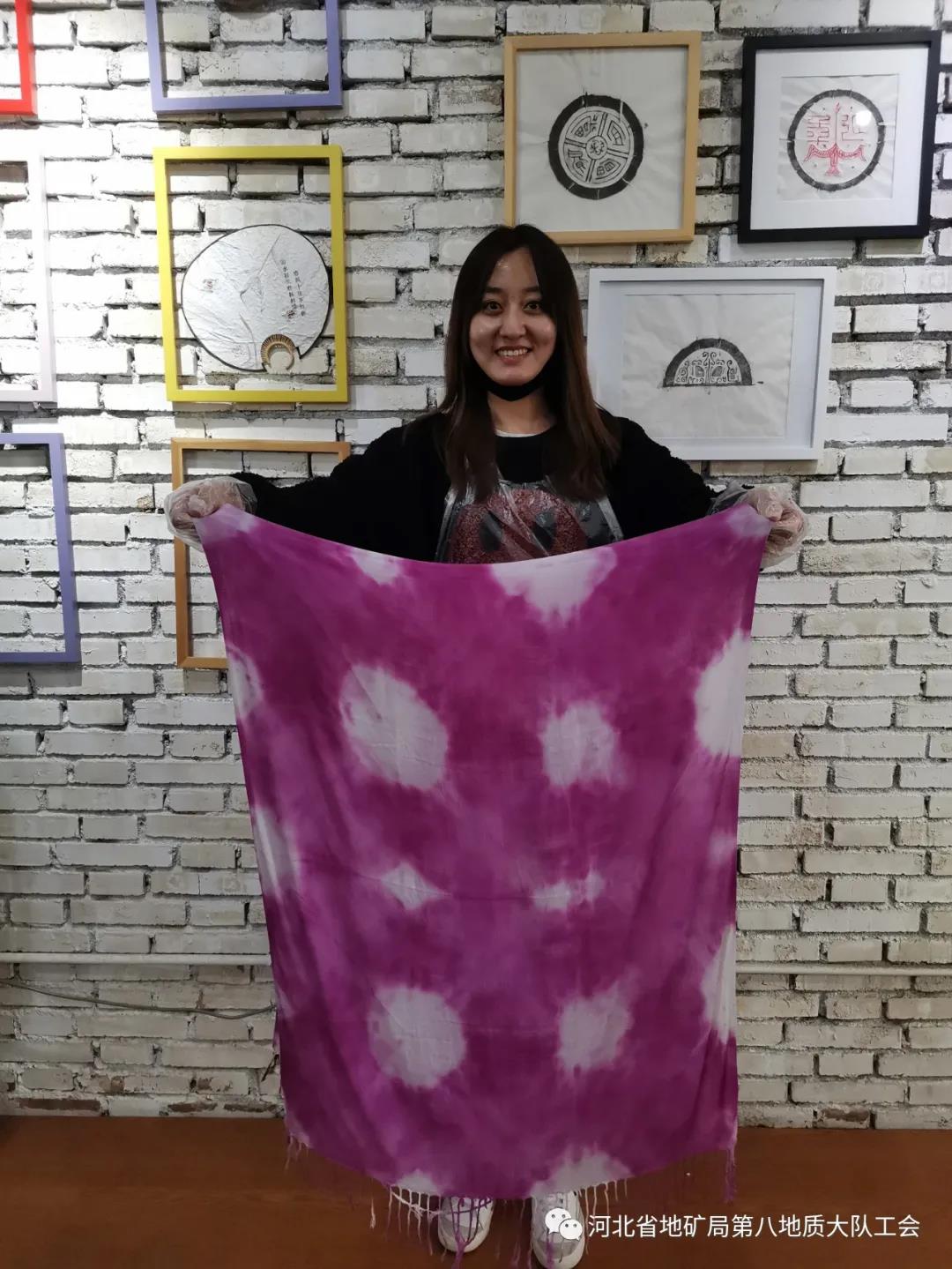 指导老师详细介绍了传统中华文化扎染工艺的艺术特征和制作原理及操作方法。大家认真聆听,相互切磋,分别挑选自己喜欢的颜料和技法进行创作,主动与老师互动,经过扎缝、浸染、揉搓、晾晒等一道道工序,在一双双灵巧的十指间呈现出了一幅幅生动美丽的画卷。