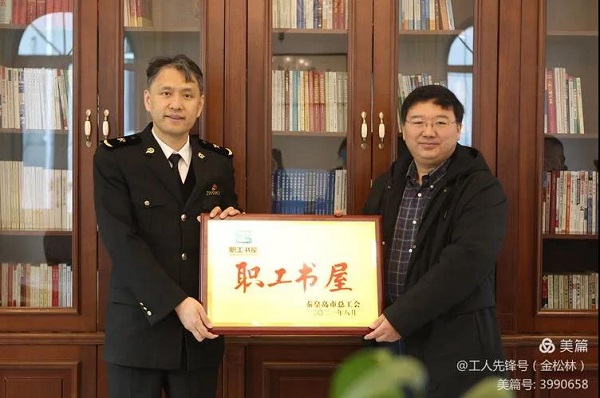 2021年12月14日上午,金彩汇党组成员、副主席陈勇珲到中国海关管理干部学院,为职工书屋授牌。学院副院长、工会主席刘辉同志全程陪同并介绍有关情况,工会副主席张华和学院工会委员会全体委员参加座谈。市总工会组织部、宣教部、网络中心和市直机关工会有关同志一起参加授牌活动。