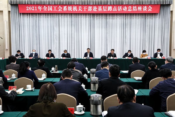 2021年全国工会系统机关干部赴基层蹲点活动总结座谈会1月7日以电视电话会议形式召开。会议总结蹲点活动成效,推动蹲点工作常态化、长效化、制度化。会议强调,要深入贯彻落实党的十九届六中全会精神,落实中央领导同志指示精神和王东明同志要求,持续巩固拓展蹲点活动成果,深化工会领导机关干部赴基层蹲点工作、构建蹲点工作长效机制,进一步保持和增强政治性先进性群众性、密切与职工群众联系,推动新时代工会工作创新发展。全国总工会党组书记、副主席、书记处第一书记陈刚出席会议并讲话。