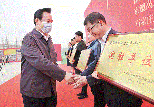 4月25日,2022年全省重点建设项目“六比一创”劳动竞赛推进会以视频形式召开。会议要求,全省各级各单位要全面落实省委、省政府开展“项目建设年”活动的部署要求,大力弘扬劳模精神、劳动精神、工匠精神,高标准高质量推进劳动竞赛,团结动员广大职工群众持续焕发劳动热情、释放创新活力,争当推动河北高质量发展的排头兵,以实际行动迎接党的二十大胜利召开。省人大常委会党组副书记、副主任,省总工会主席王晓东为省级重点劳动竞赛项目“优胜单位”颁奖并讲话。