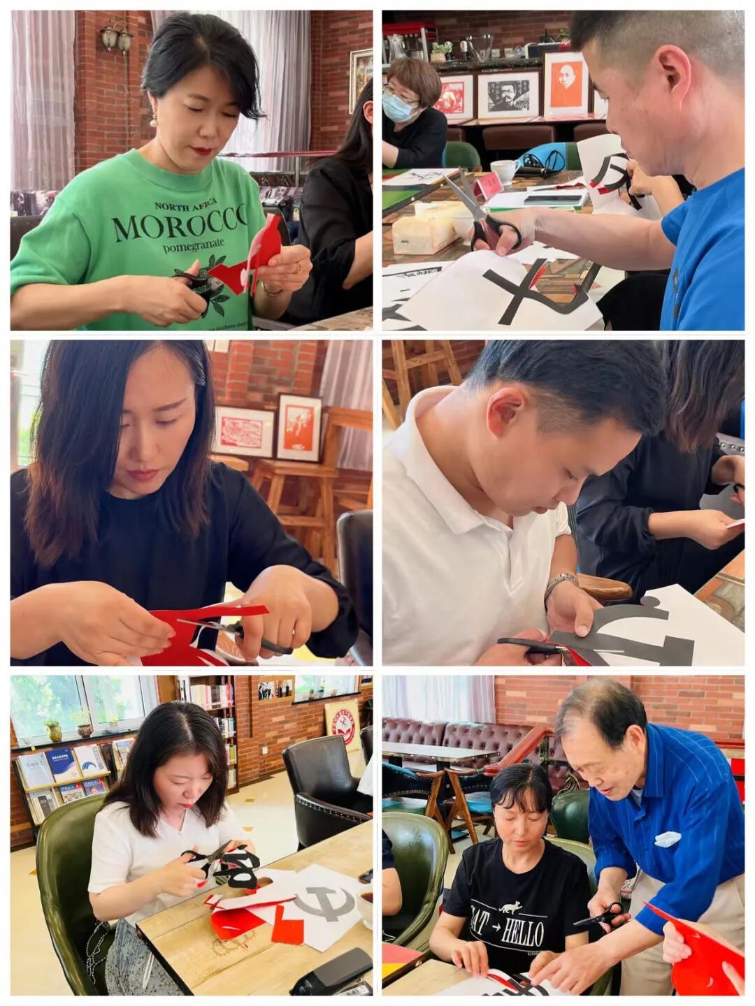 韩兵老师讲授完毕,在场教职工热情高涨、跃跃欲试。在老师的指导下,大家认真地沿着图案进行剪纸,通过折纸、翻纸、剪纸等步骤的进行,红纸上的图案跃然纸上,飘扬的党旗、激昂的文字,一幅幅剪纸故事活灵活现,一颗颗向党红心映入眼帘,一件件剪纸作品新鲜出炉。大家深刻感受着红色文化的独特魅力,将爱党爱国的情怀深深镌刻心中。