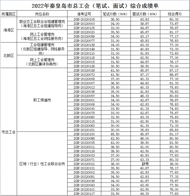 按照《关于公开招聘秦皇岛市、县(区)总工会社工工作人员公告》的招聘程序,现将已进入面试人员的(笔试、面试)所得综合成绩进行公示。