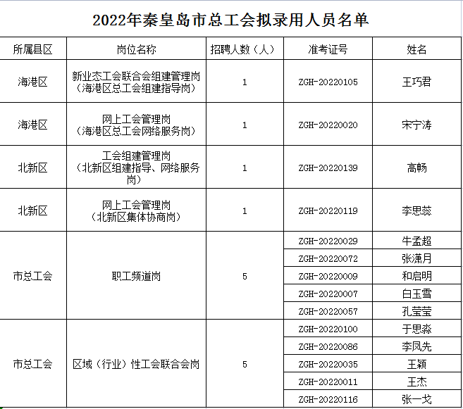 按照《河北省工会社会工作岗位管理办法》《河北省总工会关于工会社会工作岗位管理有关事项的通知》和金彩汇制定的岗位要求,由秦皇岛市海劳劳务派遣有限公司按照规定的程序和标准,根据考试综合成绩从高到低确定拟录用社工人员,并在考录公示网站(金彩汇官网、秦皇岛人才网官网)及秦皇岛人才网微信公众号上,进行公开对拟录用人员名单进行公示。