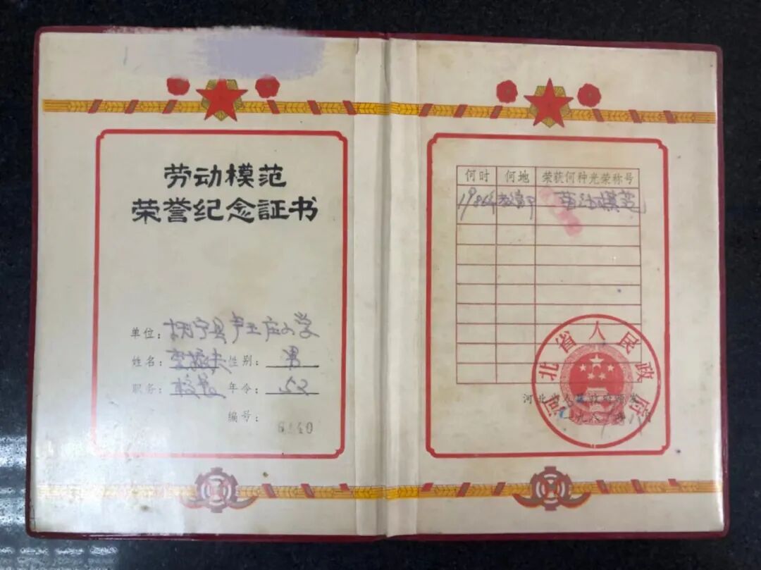 李振夫,1975年3月加入中国共产党,1986年9月评为“全国教育系统劳动模范”获“人民教师”奖章。1987年评获“河北省劳动模范”。(图为部分获奖证书、奖章以及当年受表彰宣传报纸)