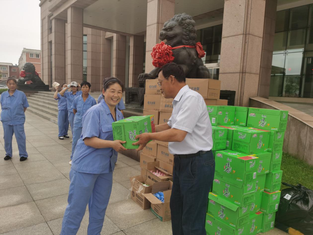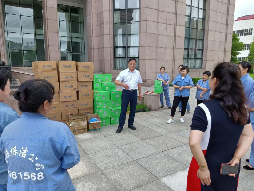 曹文荣现场为一线保洁职工们发放了防暑降温慰问品,并叮嘱大家在做好疫情防控的同时,做好防暑降温,注意身体健康和生产安全。