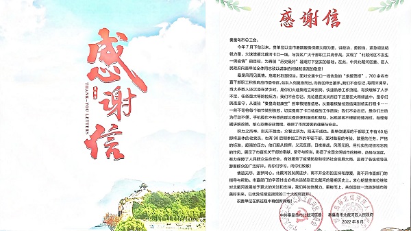 在这金秋9月,北戴河区委、区政府为我单位送来感谢信,向市总工会全体干部职工的付出致以诚挚的问候和崇高的敬意。让我们乘胜前进,再接再厉,为共创国际一流旅游城市的美好未来而努力,以优异成绩迎接党的二十大胜利召开!