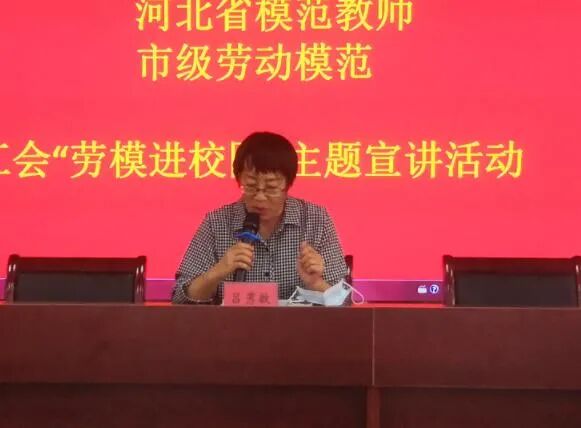 卢龙县总工会副主席吕秀敏同志发表讲话,她表示希望通过本次宣讲活动,广大教师能发扬劳模精神和工匠精神,创新教学方法,教育引导孩子们从小热爱劳动、热爱创造,通过劳动和创造磨炼意志、播种希望。