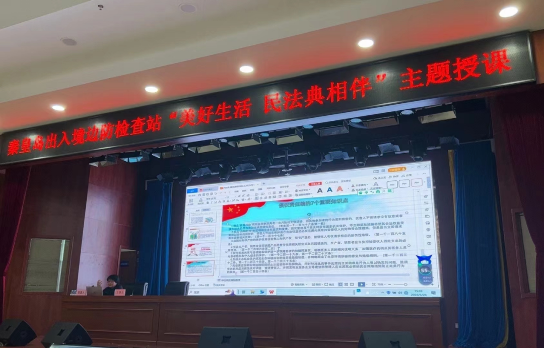 2023年5月26日金彩汇联合秦智律师事务所到秦皇岛出入境边防检查站开展“美好生活·民法典相伴”专题讲座,近百名职工参加此次讲座。程浩律师围绕民法典的立法、主要内容、重要意义以及民法典实施对国家机关的影响等内容进行了解读,并结合自己多年的执业经历,巧妙运用典型案例进行深入剖析,重点分析了与民警工作、生活息息相关的热点问题。此次讲座活动贴合生活实际、语言通俗易懂,获得了广大干警的一致好评,现场干警纷纷表示,通过本次讲座,加深了对民法典的理解,提升了法治观念,增强了尊法守法学法用法的主动性。