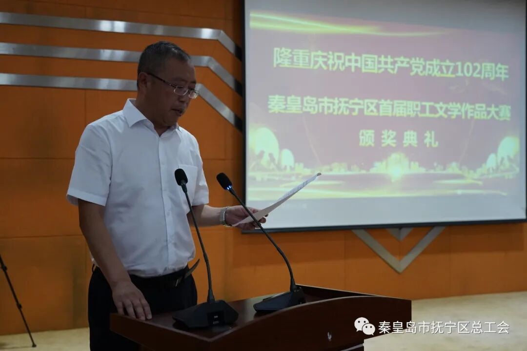 颁奖仪式上,抚宁区常务副主席曹新成宣读了大赛评奖结果,抚宁区总工会主席刘玉红、区直属工委书记张兴宇,文联主席郭丽萍等共同为获奖个人颁发证书,抚宁区税务局职工殷凤君作为获奖作者代表发表获奖感言,抚宁区委常委、宣传部长杨德尧作总结讲话。