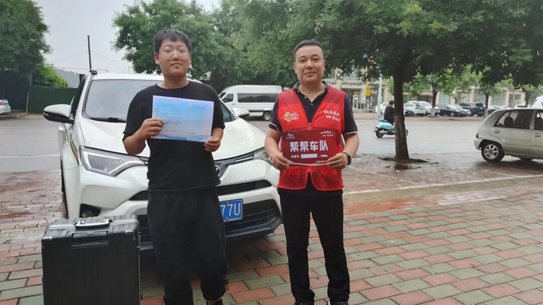 “帮帮车队”职工志愿者、住建局职工刘志佳下班回家途中,在联峰路上见到一位拉着沉重的行李箱在雨中不时回头张望着赶路的小伙儿,停车询问后得知:小伙儿名叫杨岩,是卢龙人,学生,暑假期间来北戴河打工,今天准备到北戴河火车站乘车回卢龙,一直没有打到车。刘志佳立刻邀请其上车并将其安全送到了北戴河火车站。