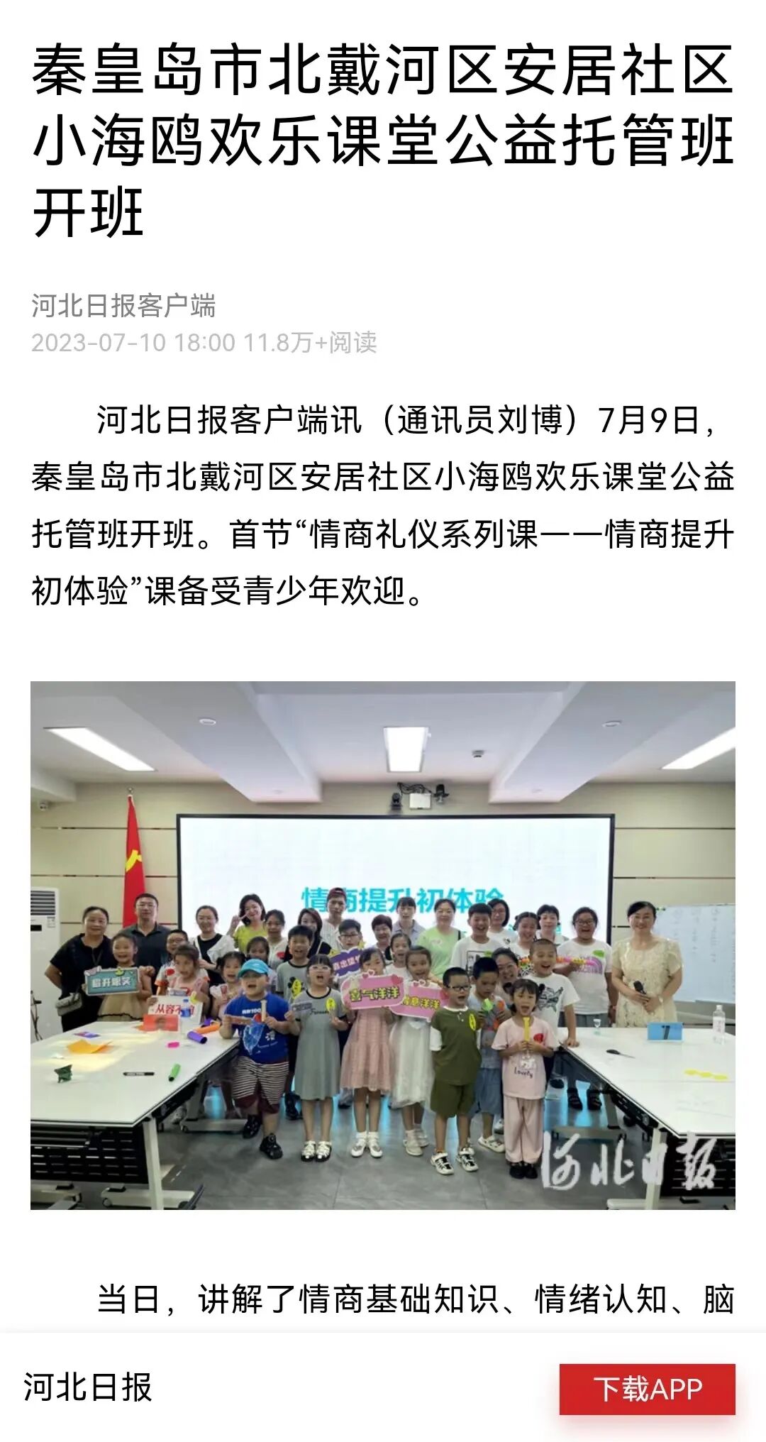 7月9日,西山街道安居社区“小海鸥”欢乐课堂公益托管班开班,首节“情商提升初体验”课备受孩子们欢迎。接下来,在为期一个半月的时间里,托管班特意为孩子们设置了绘本课程、才艺展示、绘画剪纸、益智游戏、娱乐健身、读书交流、书法创作、营地体验等形式多样的课程,让孩子们在社区度过一个安全、快乐、有意义的假期,为职工们提供暖心帮助,其创新举措在河北日报进行了报道。
