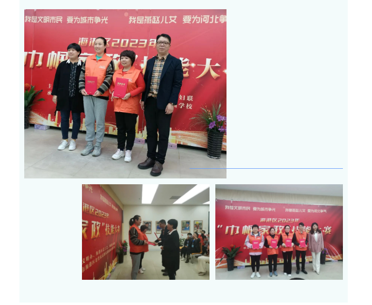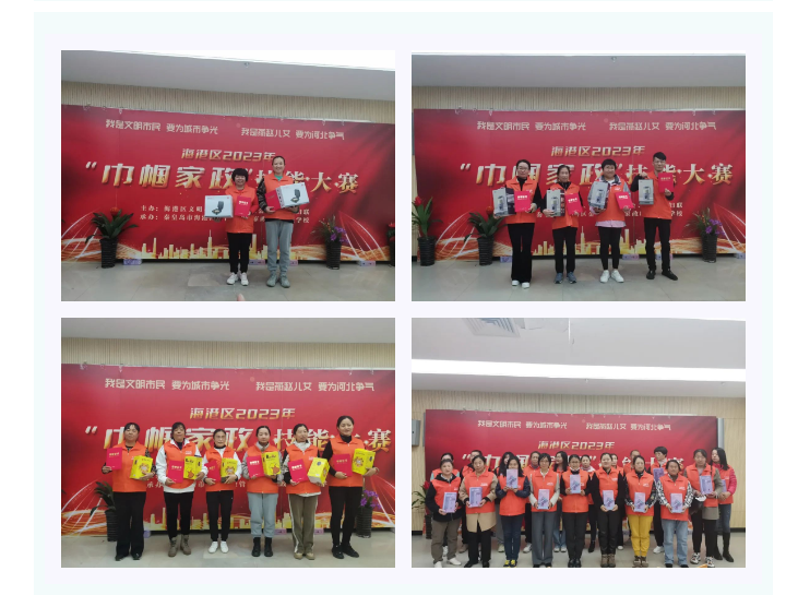 实操现场采用专业设配、模拟居家场景,打造了沉浸式的竞赛环境,选手们精神饱满、积极投入,展现出家政技术的娴熟技艺。经过4个小时的激烈比拼,两个项目分别逐出一等奖1名,二等奖2名,三等奖3名,优秀奖10名。海港区文明办、海港区总工会、海港区妇联相关领导为获奖选手颁发了荣誉证书和奖品。比赛结束后,参与培训的选手将继续进行为期3天的社会实践,表现优异者推荐就业岗位。