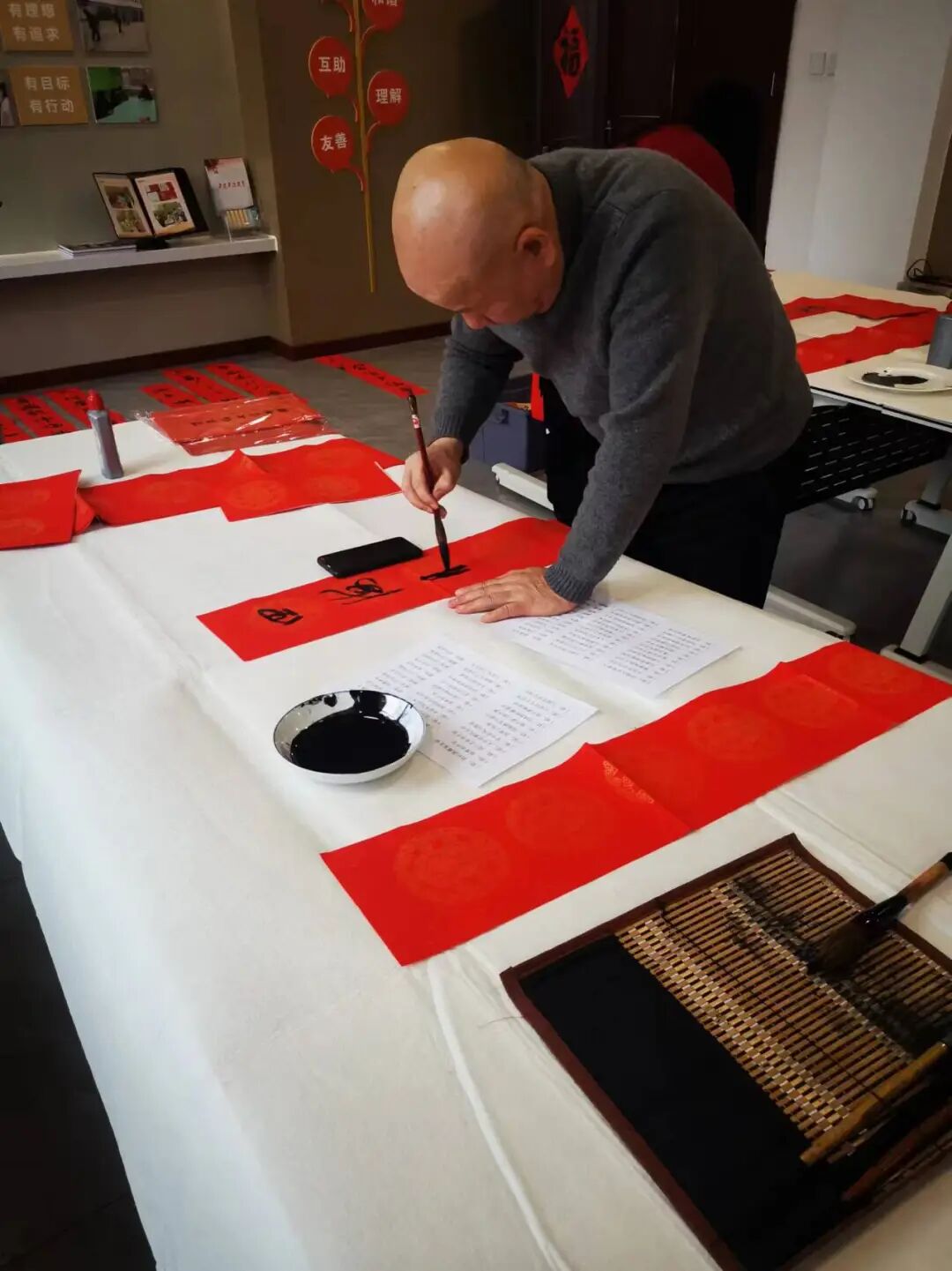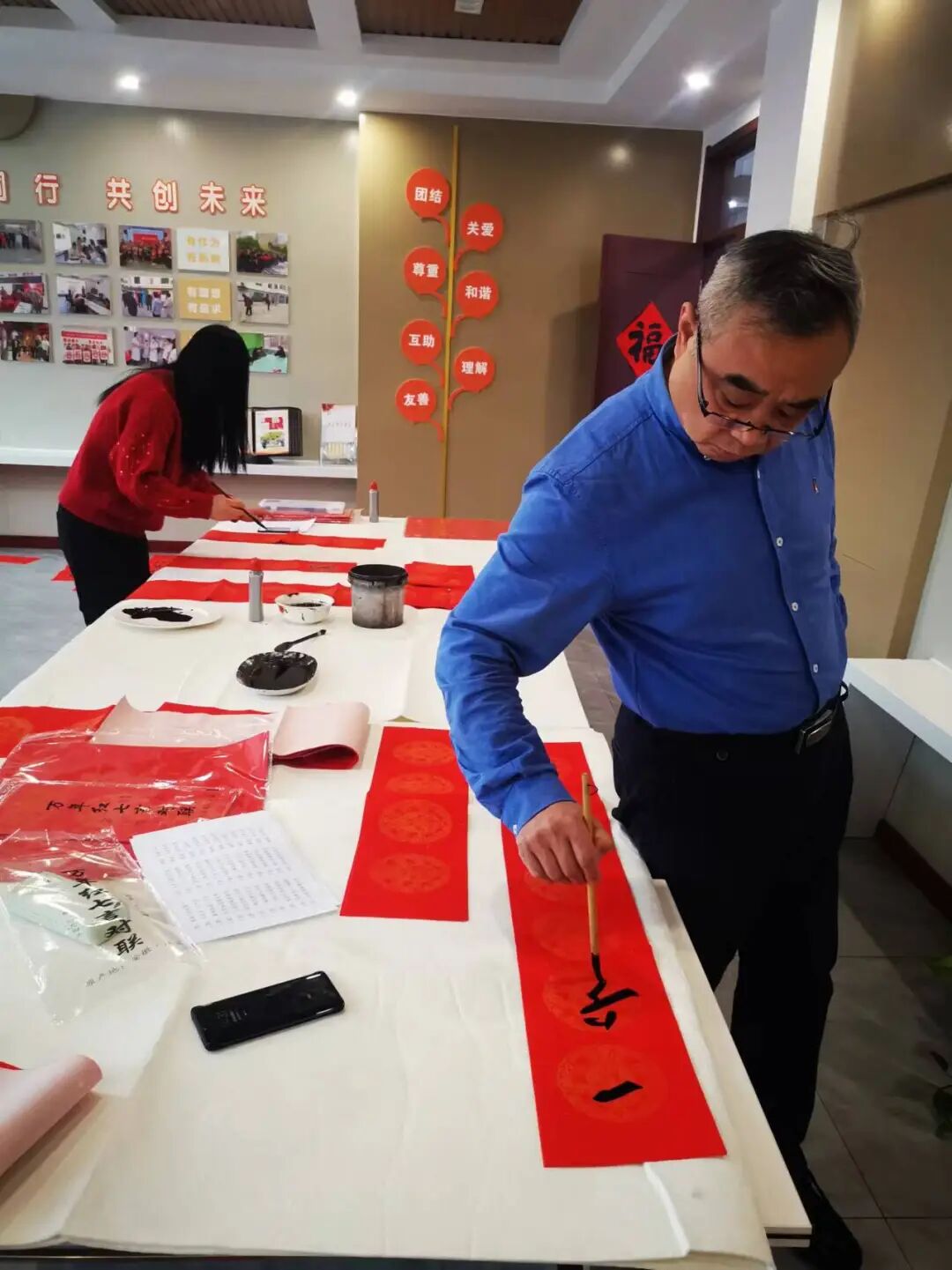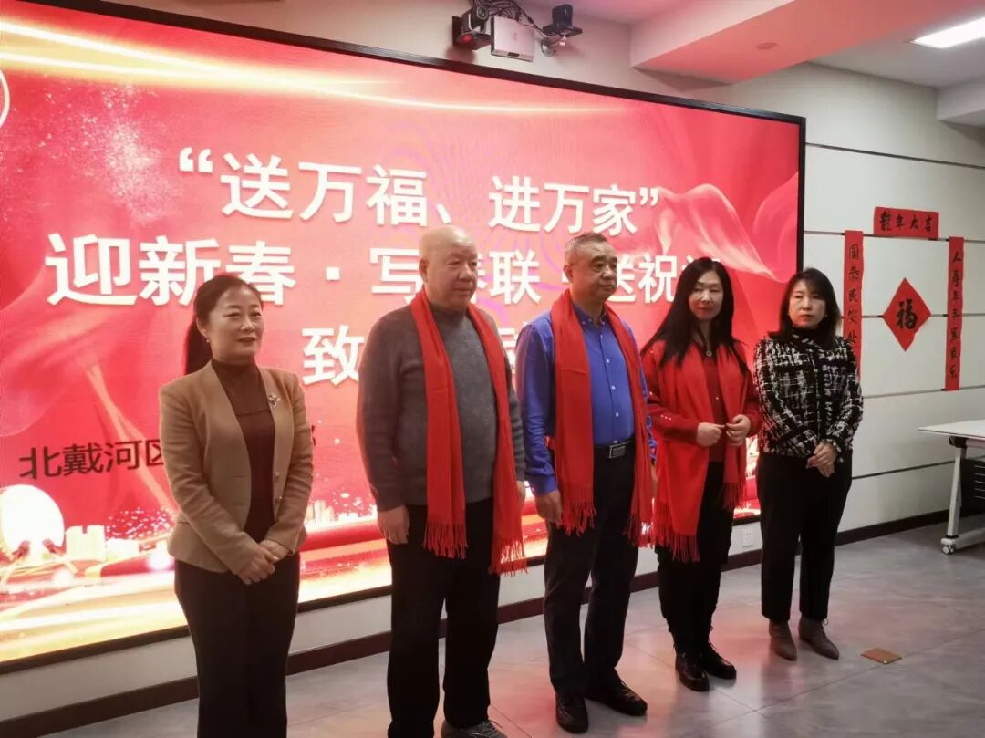 为弘扬中华优秀传统文化,展现新时代职工群众和书法爱好者的新作为新形象,营造欢乐吉祥、文明和谐的节日氛围,1月30日下午,北戴河区总工会联合区委宣传部、摄影协会、书法协会在西山街道安居社区文化名家工作室开展“送万福、进万家”迎新春 写春联 送祝福-致敬劳动者活动。部分基层工会职工代表及新业态劳动者参加活动。