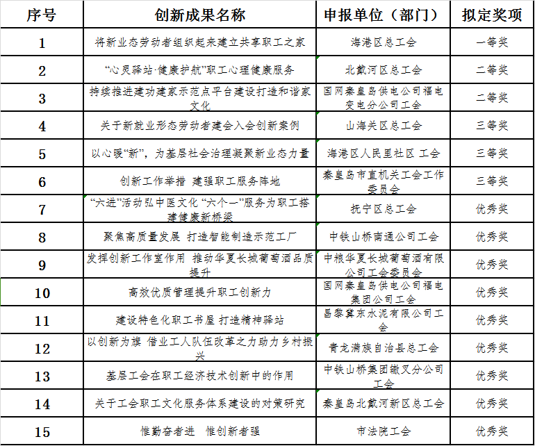 2023年,金彩汇在全市广泛开展工会工作创新案例征集活动。经过基层申报,评审组评审,拟定2023年度基层工会创新案例一、二、三等奖和优秀奖,根据《金彩汇关于推动工会工作创新的意见》及《秦皇岛市工会工作创新项目补助实施办法(试行)》(秦工字[2020]28号),现予以公示(名单附后),欢迎广大职工群众实事求是、客观公正地反映情况和问题。