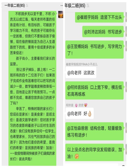 当看到医务工作者、党员同志战斗在一线的身影时,我意识到自己已经多么幸福,因为我能享有现在的安定祥和是因为有人为我们背负了很多。于是我也希望能尽我所能发挥自己的价值。我想,好好生活,认真工作就是对逆行者最好好的回报,为有效助力抗击疫情,承担起了责任和使命。面对疫情,每个人的责任担当不同,每个人选择助力抗“疫”的方式也不同,并非所有的行为都轰轰烈烈,但总会有一份初心,一种情怀值得坚守,总有一种情怀,会让人奋勇前行。每天统计学生外出情况、身体状况、报告体温,我要多渠道向学生和家长们宣传疫情防控知识,指导学习正确洗手、戴口罩、整理消毒等居家防控知识,宣传有益身心健康的自我保护教育。后来在教育局的支持下,我和学生们开始了线上学习。无论是指导学生自主学习还是进行家校沟通,过程中遇到了和以往不同的困难。但随着时间推移,开始适应线上指导学习的形式。当我收到班上王梓涵发来的视频,她手里拿着自制贺卡写着,送给亲爱的向老师,祝你身体健康,我要好好学习。孩子甜甜的笑着对我说:“向老师我想您了!”我真的为这些可爱懂事的孩子们感到幸福。在校领导们的体贴关怀下,我们虽然人在家中心却和大家紧贴在一起,始终不会忘记身为一名人民教师的使命。