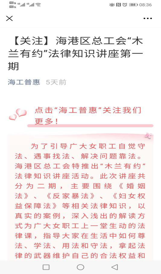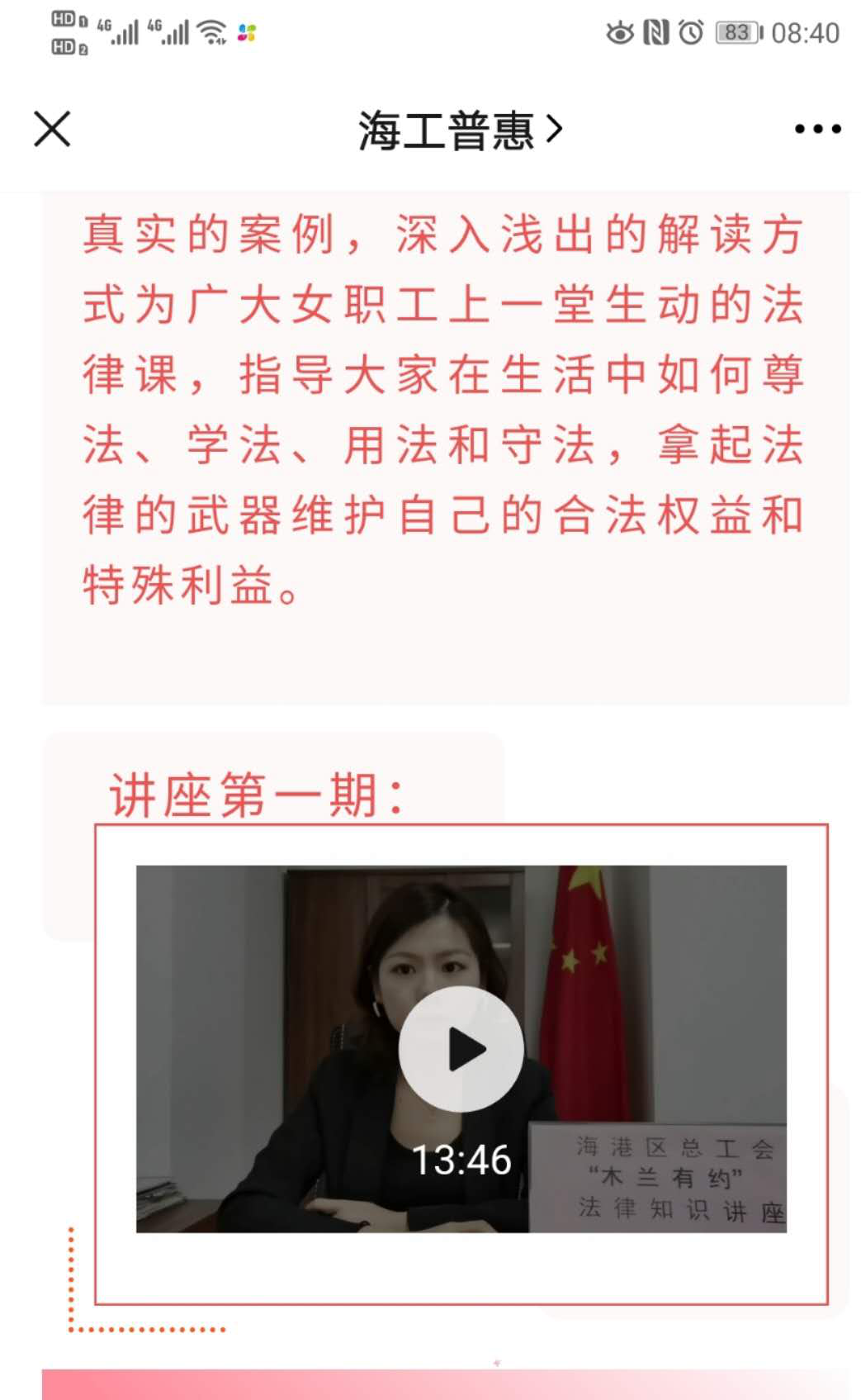 为了引导广大女职工自觉守法、遇事找法、解决问题靠法。海港区总工会特推出“木兰有约”法律知识讲座活动。